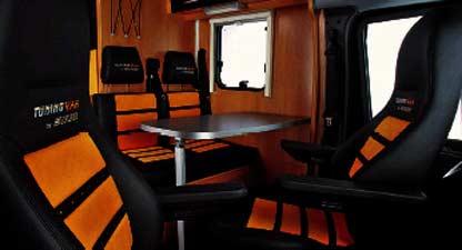 Om Tuning Van ser spesiell ut utvendig, er den enda mer oppsiktsvekkende innvendig. På gulvet er det lagt et svart teppe, og den samme fargen går igjen både i deler av taket og på skapene. Setene er spesiallagde sportsseter fra Aguti, som ikke bare ser spesielle ut, men som også har skikkelig sittecomfort. For å virkelig understreke at dette er en spesiell bobil har Hymer satt inn et multimedia anlegg som inneholder både et topp musikkanlegg fra Pioneer, med en rekke høytalere, subwoofer og surround-anlegg. Det finnes også en DVD-spiller i bilen, og selvfølgelig en stor flatskjerm TV. Over sengen er det i tillegg to 10-tommers TVskjemer, der du kan spille TV-spill, samtidig som du ser din favoritt film.