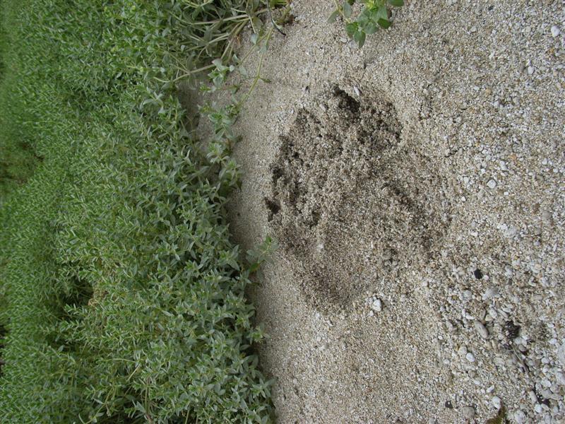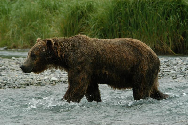 Den neste store opplevelsen denne dagen er landgangen. Vi har vadere på og går de siste meterne til land. Bjørnen med den lille ungen har gått inn i skogen, men skogen er så tett, at jeg ikke kan se om den står en meter inne og holder øye med oss. De andre bjørnene går og roter i vannet etter mat og virker helt uberørt av vår ankomst. Vi går opp langs elven på en lang rekke. Vi må gjerne snakke, men ingen sier forståelig nok ikke et ord. Spenningen er intens. Vi er til de grader i bjørneland. Piloten vår er samtidig vår guide, men han er ubevepnet. Han forteller at han har vært her de siste fem sesongene. Jeg bestemmer meg for å holde meg i nærheten av han… Et stykke oppe langs elven, ved et godt fiskested, setter vi oss på en sandbanke med høyt gress og venter. Det går bare få minutter før den første bjørnen kommer forbi.