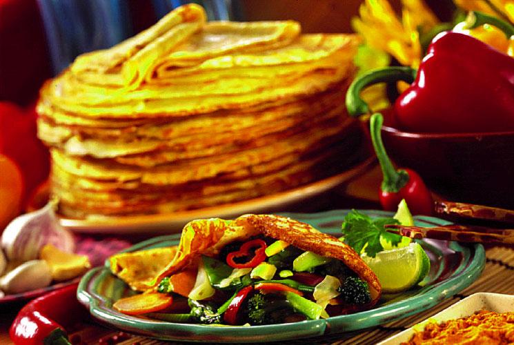 Erstatt halvparten av melet med 1 1/2 dlsammalt hvetemel eller erstatt alt meletmed grovbakstmel.Forslag til fyll:200 g kjøttdeig1 løksalt og pepperca. 1/2 ts chilipulver1 liten boks tomatpuréca. 1/2 dl vannStek kjøttdeig og finhakket løk. Smak tilmed krydder og tomatpuré. Rør inn littvann og la kjøttstuingen få surre litt. Leggfyllet på pannekakene og rull sammen.Serveres varme, gjerne med salat til.