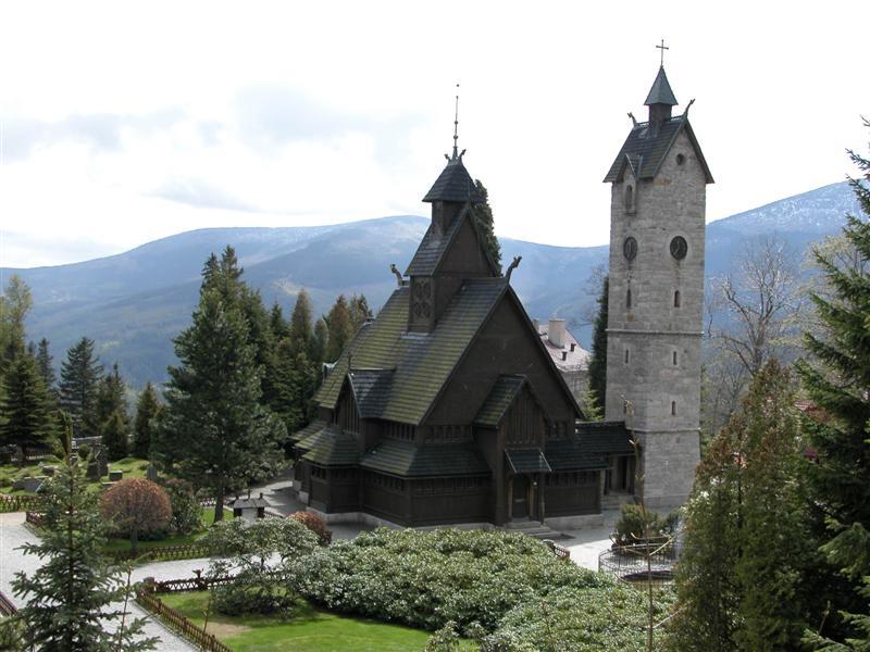 En norsk stavkirke I den vestlige delen av byen Karpacz, 10 km syd for campingplassen, finner vi noe så usedvanlig som en norsk stavkirke. Den er over 700 år gammel og kommer fra Valdres i Norge. I 1841 ble den dengang falleferdige kirken med navnet Vang, transportert til Karpacz. Kirken ble kjøpt av den preussiske kongen Friedrich Wilhelm 4., hvoretter den også gjennomgikk en omfattende restaurering. Kirketårnet ble imidlertid bygget i stein, fordi man mente at det høye tårnet ikke ville kunne stå imot den barske naturen i fjellene. Resten er originalt.