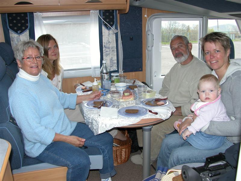Tilbake ved vogntogene er det klart for lunsj. Vi er alle skikkelig sultne etter fotturen i det kuperte terrenget. Britta og Rikke tilbereder en god lunsj i bobilen, mens Rasmus og jeg får filmet et innslag.