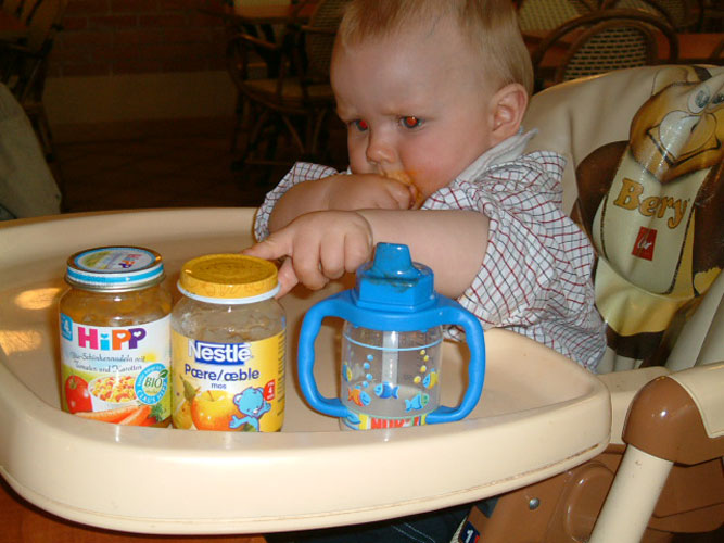 Jeg kjøpte litt forskjellig og lot Mathias være forsøkskanin over et par dager. Alt ble spist med stort velbehag og uten rynker på nesen. Forskjellig grønsaksmos med flere slags kjøtt og fisk. Ikke på en gang, men i flere variasjoner. Uten problemer, så nå når vi har prøvd vil jeg en annen gang ikke dra med meg hjemmefra.
