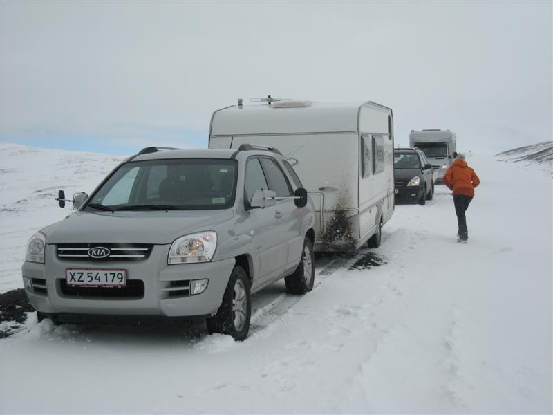 Vi hekter av campingvognen, mens Rasmus går til fots omtrent en ½ kilometer fram for å sjekke veiforholdene. Han kommer tilbake og forteller, at det ser ut som om det bare dreier seg om 2-300 meter med 20-30 cm snø. Han kjører turen et par ganger for å lage spor til oss. Mens han gjør det kommer det en islending i en Toyota Landcruiser, og bekrefter at det bare er dette stykket, hvor det ligger så mye snø. Vi hekter på igjen og alle tre vogntogene kommer fint gjennom den dype snøen. Campingvognen fordi den har en bra trekkbil. Teltvognen fordi den bare følger med. Bobilen spant litt, men Oles erfaringer gjorde at han også kom fint igjennom.- Det handler om å kjøre i det riktige gear og holde et godt moment – imidlertid uten å kjøre for hardt. Altså finne balansen mellom fornuftig fart og ikke kjøre seg fast. I følge Ole.