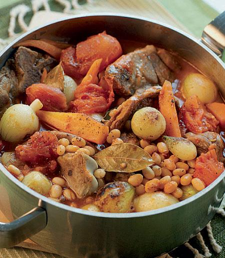 1 ½ kg lammekjøtt med ben3 ss olje eller margarin til steking2 stk. løk2 båt hvitløkca. 2 dl rødvin1 boks hermetiske tomater1 boks hermetiske tomatbønner2 stk. gulrot1 ts salt½ ts pepper1 ts tørket timian½ l vann1 stk. laurbærbladevt. 1 ts sukkerSlik gjør du:Stek kjøttet, småløk og hvitløk til kjøttet har fått farge i en gryte, og ha i rødvinen. Tilsett tomater og gulrøtter. Krydre med salt, pepper, laurbær og timian. Ha i vann og la det småkoke i ca. 1 1/2 time. Tilsett tomatbønner. La alt bli gjennomvarmt. Server med ferskt brød og/eller ovnsstekte potetbåter. Tradisjonell lammestek med hvitløk og rosmarin. Enkelt, saftig og velsmakende!