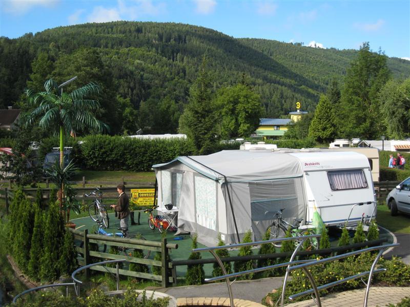 Det her er virkelig en tur, der vi setter pris på det gode været, for vi er ute hele tiden. Vi sover bare inne i campingvognen. Her på Burgstaller Camping får vi anvist en fin plass, slik at vi igjen kan komme ut og oppleve noe.