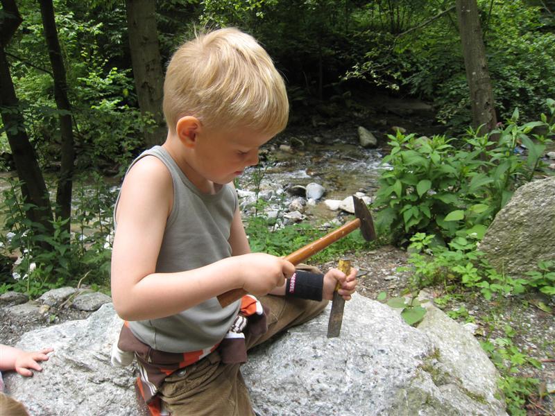 Campingplassen arrangerer en litt annerledes tur – en såkalt ”granatentour”, der vi skal ut og hakke i fjellet etter krystaller. Et populært tiltak, med flere hundre deltagere der alle kan være med. Vi starter med å gå gjennom skogen, der vi kommer forbi et par flotte fossefall med det klareste vann