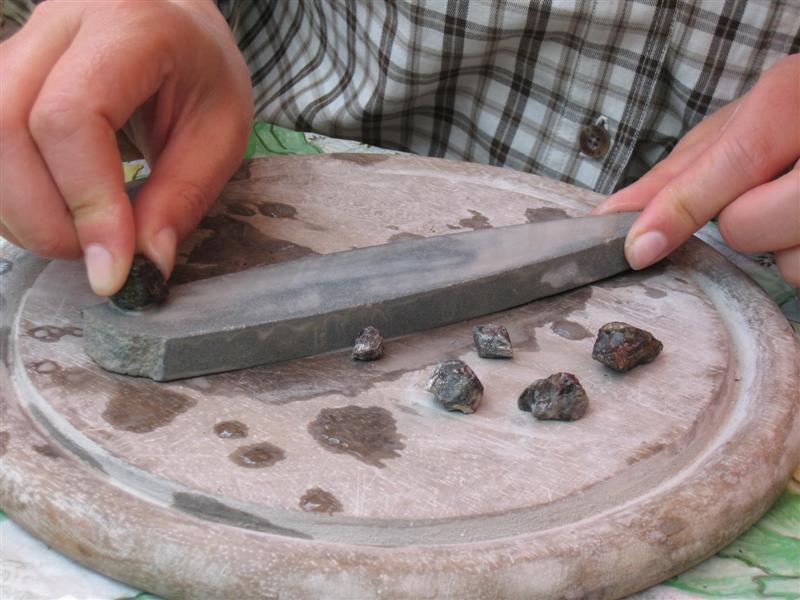 Tilbake på campingplassen får vi stilt utstyr til rådighet, som kan brukes til å slipe steinene fine og blanke, slik at man kan sette dem i et smykke eller ha dem til pynt. Det tar lang tid, men resultatet blir flott dersom man har tålmodighet til det.