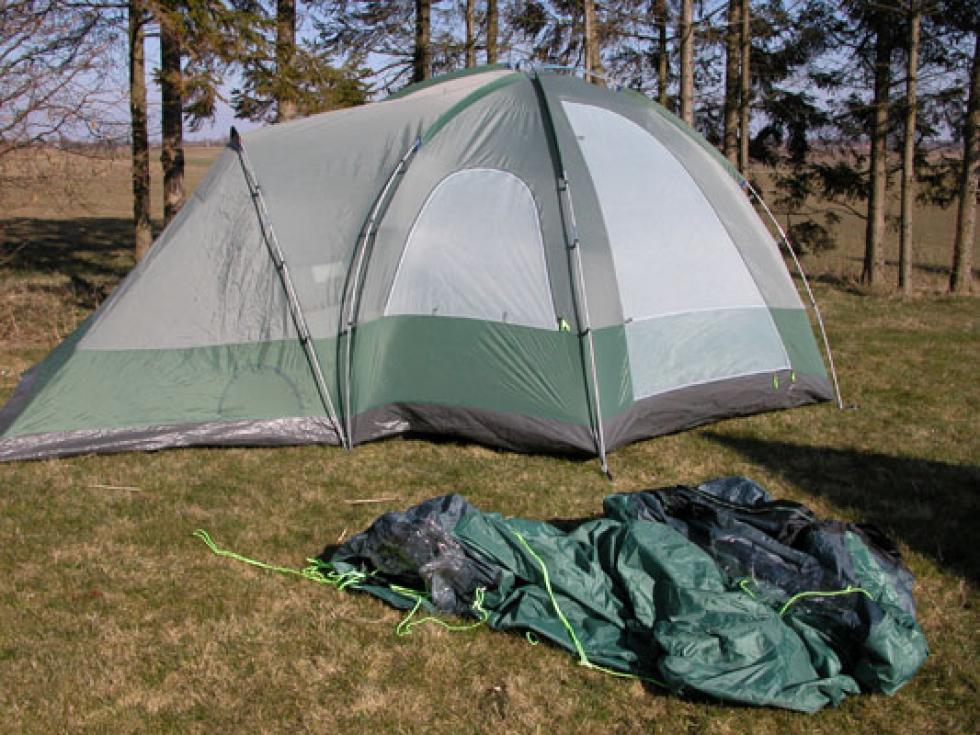 Start med å bre teltet ut på gresset og finn åpningen. Sjekk at det ikke er harde eller skarpe gjenstander under teltbunnen, og spesielt i de 3 sovekabinene. Kontroller også at det er så plant som mulig, da er det lettere å få teltet til å stå riktig.Hjørnene plugges slik at teltet ikke blåser bort. Deretter føres de 3 lange blå stengene til taket inn i teltets løpebaner i taket, etterfulgt av de tre røde stengene som løfter kabinene.Når alle 6 stengene er på plass kan du begynne å heve teltet. Alle stengene settes fast i de krokene, som sitter i teltets hjørner. Sørg for at alle vinduene er stengt, slik at teltet kan strammes opp. Nå kan overseilet settes på og strammes opp med plugger og barduner. Endelig monteres stengene til apsis og portal.