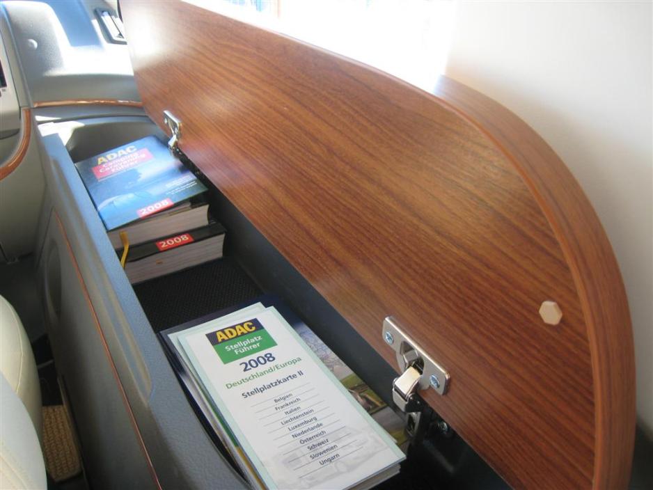 Ved siden av passasjersetet er det et lite rom, som er praktisk til guidebøker og kart. I det hele tatt er det bra med oppbevaringsplass i førerhuset. Setene har justerbare armlener. Musikkanlegget (JVC) spiller bra. Solskjermene går langt ned tross stor frontrute. Dør ved førersetet er veldig praktisk å ha og vinduene kan åpnes på begge sider. Som sagt bruker man mye tid her, men det gjøres med stort velbehag. Man sitter godt i stolene, noe som er viktig, fordi de også kan snus, slik at de blir en integrert del av stuen.
