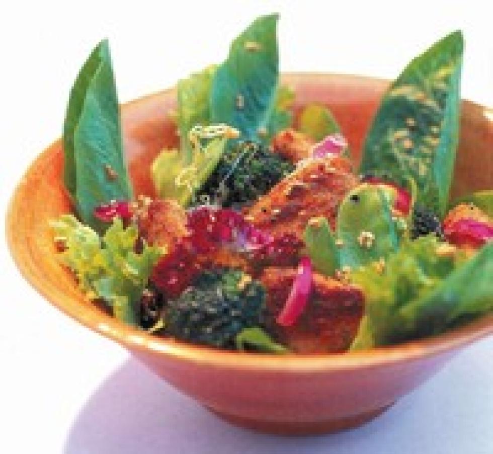 4 pors300 g nuggets. Kjøpes ferdige1 ms oljebroccolibuketter100 g sukkererter1 liten bit hakket fersk ingefær2 hakkede hvitløksfedd1 rødløk - store biter2 ms rødvinseddik1 ms honning½ ms grønnsakbuljonglett ristede sesamfrøStek nuggetene som angitt på pakken. Varm oljen i en wokpanne eller stekepanne. Stek grønnsakene i noen minutter. Hell blandingen av eddik, honning og grønnsakbuljong og kok opp alt sammen.Legg grønnsakblandingen på et fat. Fordel nuggetene på fatet og strø over sesamfrø.Serveres med for eksempel hvitløksbrød. Nuggetene kan erstattes med fiskepinner eller kyllinglår med feks. chillismak.