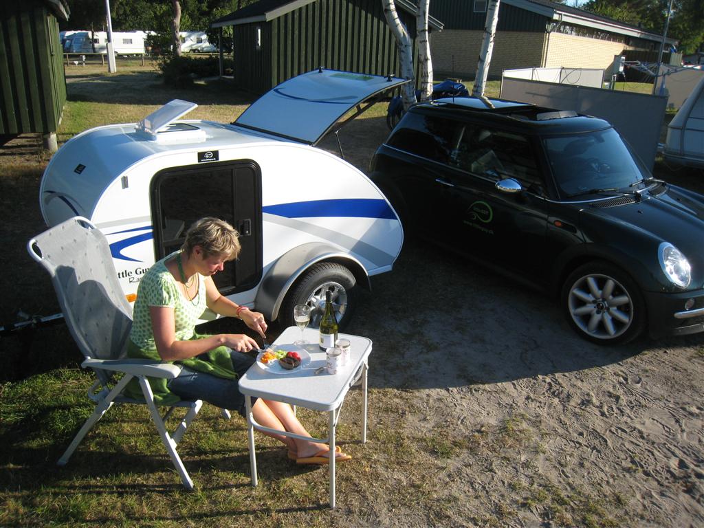Man forelsker seg straks i Little Guy, som den lille amerikanskbygde campingvognen heter. Også selv om man deretter tenker på om man virkelig vil kunne bo i den. Kan man overhodet fungere i en så liten campingvogn eller er den mest effektiv til å tiltrekke oppmerksomhet langs landeveien og når man ruller inn på campingplassen – for det kan den.Før vi kom ut av bilen var vi omringet av de første tyve nysgjerrige naboene, som av gode grunner aldri hadde sett vognen før.