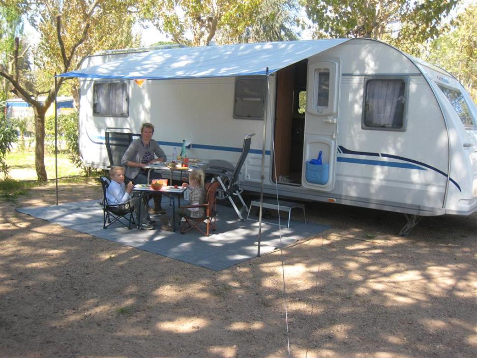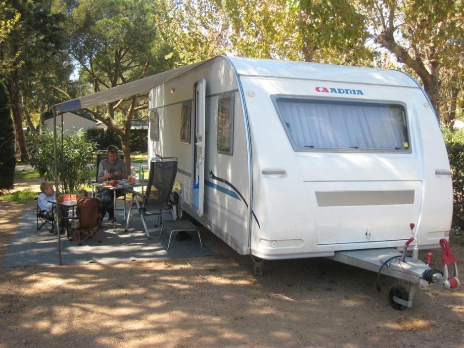 Ved Middelhavet fikk vi perfekt vær med sol fra klar himmel, så denne gangen satte vi opp solseilet. Igjen var det grus på oppstillingsplassen – på med Bolon teppet, så slipper man unødvendig rengjøring inne i campingvognen.