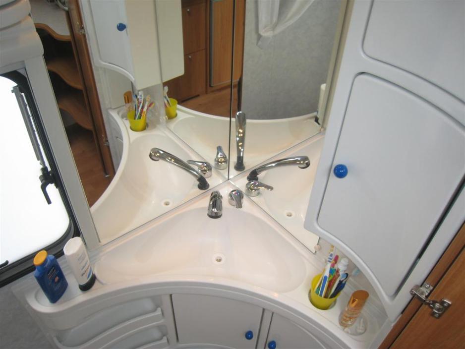 Man kan ikke få alt og plassen på toalettet er nedprioritert. Det er jo heller ikke her man tilbringer ferien… det er faktisk ikke mulig for en person på over 185 å sitte ned uten at knærne treffer skapene. Man kan heller ikke gå inn og hjelpe et barn. Vinduet vender ut i forteltet – her vil man nok foretrekke en takluke. Toalettet har en hånddusj. Man kunne med fordel ha dratt inn litt på det første garderobeskapet, som er ved siden av toalettet for det er masser av oppbevaringsplass i vognen.