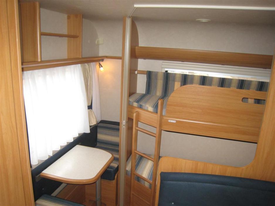 Barna har sitt eget rom, og det er bakerst i campingvognen. Det har flere fordeler. Når barna har lagt seg i sengene ligger de lengst bort fra stuen. Når de leker, kan de gjøre det uten å forstyrre de voksne, som sitter og prater i stuen. Ved siden av køyene er det hyller og et lite nattbord.Spesielt positivt er passasjen mellom køyene og dobbeltsengen. Her kan en voksen alltids komme inn til barna, når de skal legges. Ved sengenes fotende er det et mindre sittearrangement for to barn. Det er oppbevaringsrom under sofaene. Bordet kan også slås ned så man får en liten benk – alternativt en liten seng ekstra.