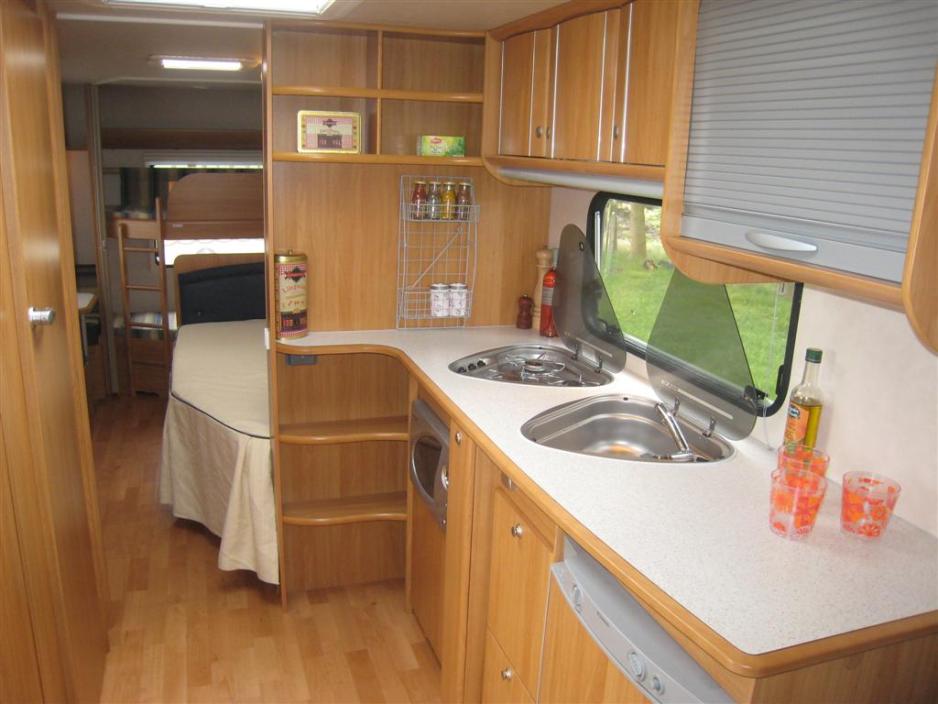 Kjøkkenet er virkelig et stort pluss i denne vognen, hvis man liker å lage mat og barna i tillegg gjerne vil hjelpe til. Til høyre for vasken er det stor benkeplate, der mindre barn kan stå og hjelpe til i sikkerhet – borte fra gasskomfyren. Bordet er høyt.Det er masser av praktiske skap og uttrekkskuffer. Kjøleskapet er, vognens størrelse tatt i betraktning, imidlertid for lite, med mindre man handler hver dag. Det er godt med gulvplass foran kjøkkenet, slik at man lett kommer forbi hverandre. Det gir en følelse av romslighet.