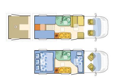 Ser man nærmere på planløsningen har Coral 660 SL en dinett foran som er integrert med de to vendbare pilotstolene i førerhuset. En løsning som for tiden er helt dominerende blant hel- og halvintegrerte biler. På denne modellen finnes ytterligere en vendbar sitteplass i form av et enkeltsete der man kjører med ryggen i kjøreretningen dersom man er maks fem passasjerer.Dinetten er selvsagt mulig å gjøre om til soveplass, men blir bare til en enkeltseng. Kombinert med de to enkeltsengene bak sover tre voksne bra i bilen. For flerbarnsfamilier har imidlertid produsenten laget en løsning der man slår sammen sengene bak til en større trippelseng. Den forutsetter i prinsipp at barnet ikke er for stort og ligger i midten dersom man skal komme opp i sengene på en enkel måte.Mellom dinett og soverom finnes kjøkkenseksjonen med en garderobe ved siden av og midt i mot er toalettet – med separat dusjrom – plassert. Den nye typen av Dometic-kjøleskap har en mer letthåndterlig låsemekanisme og LED-pærer som gir et blått skinn. Hvorfor blått kan man jo lure på, men LED-pærene virker å bli mer og mer vanlig siden de gir et sterkt lys men trekker nesten ikke noe strøm og heller ikke blir varme.Komfyren har fire bluss og skrått ovenfor finnes en ovn med grillfunksjon, noe som gjør at det går å bedrive en mer avansert matlagningsfunksjon og til og med baking. Spørsmålet er imidlertid om ikke en mikrobølgeovn hadde vært mer anvendelig.