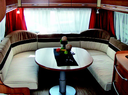 I testvognen er det kun en sittegruppe, og det er en stor rundsitter i lyst stoff. Bordet er rundet av i kantene, og følger de runde kantene i sofahjørnene. Ganske så smakfullt. Dette forenkler også tilgangen ut og inn av sittegruppen. Over sittegruppen er det åtte overskap, og unde finner vi også der masse plass til oppbevaring. Her er det også tilgang fra en lasteluke utvendig. Spotter i hvert hjørne, og fire spotter rundt en stor takluke gir godt lys på bordet.