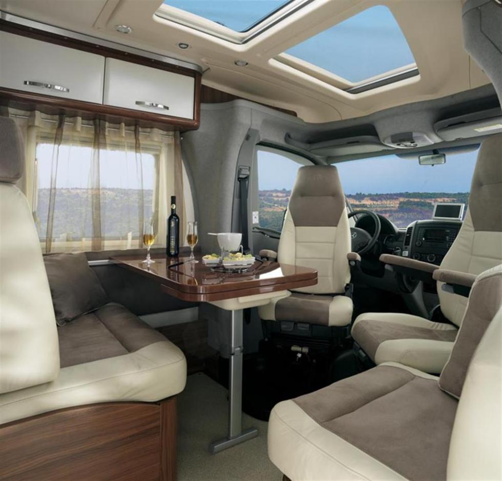 Samværedelen består av en dinett med veldig høy sittekomfort på venstre side samt en separat sitteplass – kanskje for en avslappende lesestund – på høyre side. Dinetten går dessuten å gjøre om til en ektraseng for en person.Panoramatakvinduet smelter farge- og formmessig inn i det øvrige designet, og runt takvinduet finnes spotlights som gir et behagelig lys. Hele overgangen mellom førerhus og bodel kjennetegnes dessuten av myke svepende linjer som gir en trivelig følelse.Umiddelbart innenfor døren, finnes en flatskjerms-tv, og takket være at denne er montert på et justerbart feste kan den vinkles enten mot samværedelen eller mot soverommet.