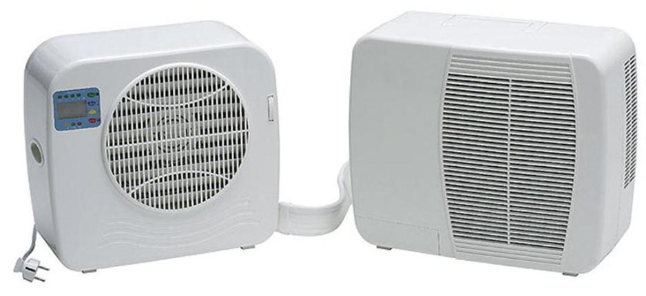 Portabelt split-anlegg (innendørsenhet+ utendørsenhet) for Campingvogn.Nettspenning: 230 V. Effektforbruk(ved kjøling): 420 W/1,96 A. Kjøleeffekt: 2750 BITU/0,8kW. Temperaturinnstillinger: < 22–28 °C Timerfunksjon:0,5–7,5 h. Elektronisk innstillingspanel.Mål (innendørs-/utendørsenhet): 39,5 x 36 x 18 cm/43,5 x 41 x 20 cm. Vekt: 20,5 kg.