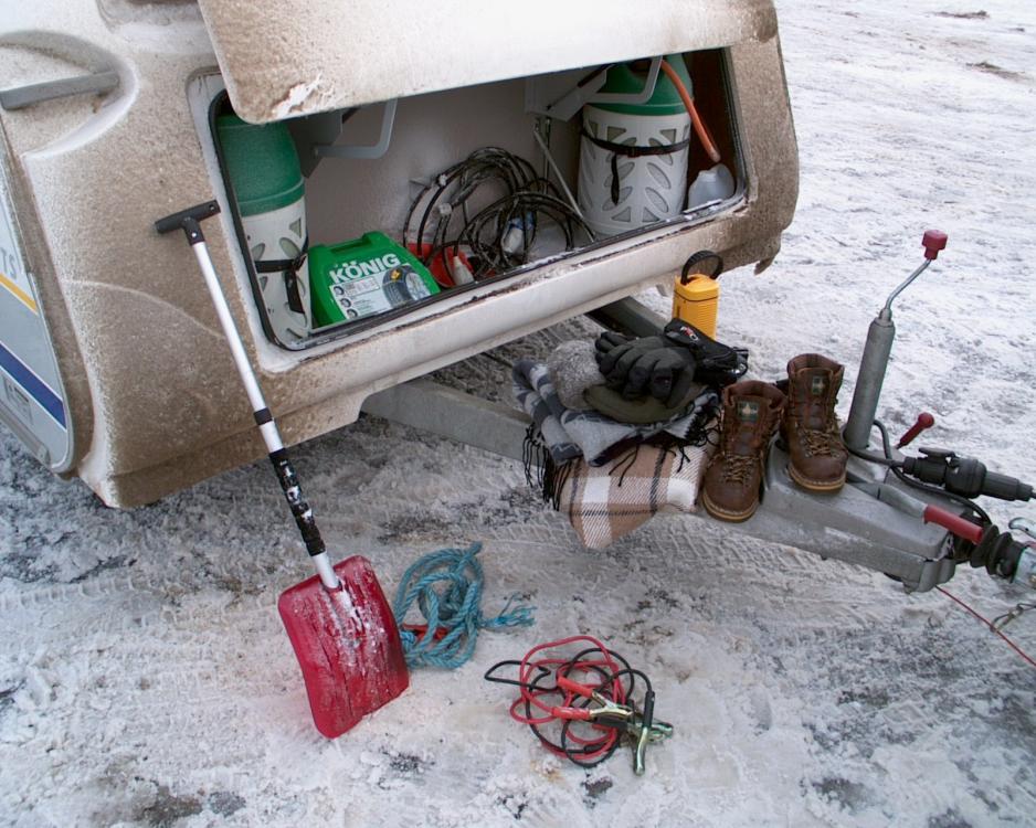 Kjettinger. Husk å prøve å sette dem på hjemme, slik at det sitter i ryggraden, når de skal brukes. Slepetau, startkabler, en spade, lykt – gjerne med stor lyskjegle. Gjerne en hodelykt, som gjør at hendene blir fri til å arbeide. Tepper og varmt tøy. Pakk ikke skitøyet for langt ned. Små fingervanter, slik at man kan jobbe. Skikkelig fottøy.Fordelen ved å ha med campingvogn er, at man har sitt lille hjem med på kroken. Blir været for dårlig til å kjøre i. Ja så sving til siden, ta en lur, noe å spise, til forholdene blir bedre igjen.