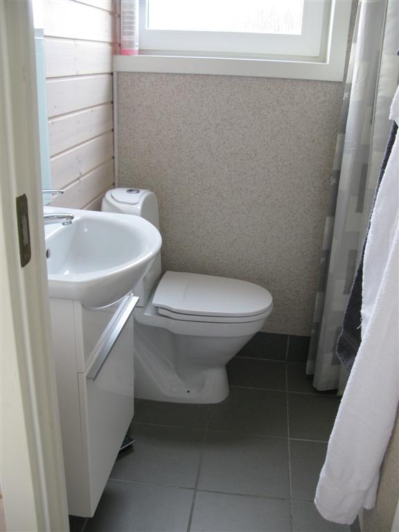 Selv om badeværelset ikke er så veldig stort har det både et dusjkabinett, et toalett og et skap med håndvask til å oppbevare toalettsaker i. Badeværelset har både vindu med mattet glass og gulvvarme, så det er gode muligheter for et ordentlig klima på badeværelset, noe som er deilig, når man er mange på liten plass.