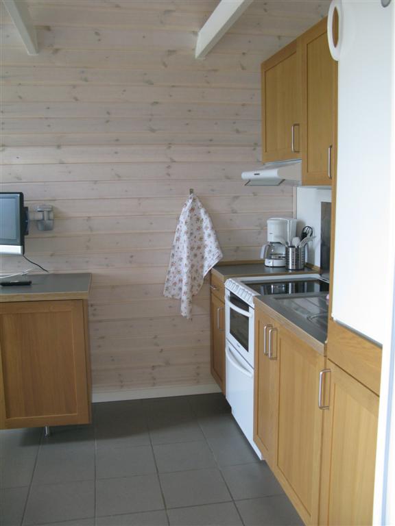Når man går til høyre i spisestuen kommer man direkte inn i kjøkkenet og stuen. Kjøkkenet har alt som trengs og på en lengde på bare 2,5 m. Kjøkkenveggen har både et ganske stort kjøleskap med 3 hyller og en liten fryseboks og en super komfyr samt en integrert oppvaskmaskin, som har plass til oppvasken etter et måltid for hele familien. Kjøkkenet er dessuten fullt utstyrt med servise til 6 personer samt skapplass til å oppbevare de innkjøpte kolonialvarene, så det ikke er nødt til å stå på kjøkkenbordet eller i en kasse eller bærepose. På den andre siden av kjøkkenveggen er stuen med en liten lenestol, sofabord og en treseters sofa. På veggene henger også en liten flatskjerm med dvd-spiller.