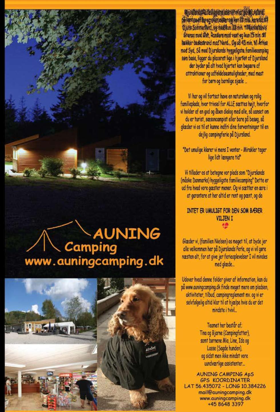 Auning Camping har gått til det skritt og sammen med utvalgte leverandører av gastronomiske opplevelser og daglige behov, å lage en ny forbedret brosjyre, som i tillegg til å pirre lesernes forventninger til et besøk på Auning Camping, også gir dem en enkel adgang og overblikk over hvor de kan handle dagligvarer, samt hvor de kan dra med familien, når de har lyst til å gå ut å spise…Dette kan du se i plassens nye 3-delte brosjyre, som i tillegg til å være et ”verktøy” som alle gjestene får tildelt sammen med destinasjonsbrosjyren ved ankomst. Den samme brosjyren ble også i år brukt i markedsføringen av plassen på ulike messer, slik at de samarbeidspartnerne som annonserer i brosjyren, også får mulighet til å nå de turistene, som kanskje ikke velger Auning Camping som overnattingssted, men likevel velger å besøke Auning By.Som gjest på Auning Camping blir man møtt av en moderne informasjon der Campingfatter & Co. tar imot gjestene. Det er nyhetsinformasjon hele dagen - om formiddagen DR Update og etter siestaen en inspirasjonsvideo om de mange tilbudene, som de ulike aktørene på Jyllands hyggelige ”nese” har å by på. Alle får ved ankomst Auning Campings brosjyre som forteller om, hva man kan oppleve i nærområdet og ikke minst, hva man kan forvente av trivelige opplevelser mens man oppholder seg på Djurslands hyggeligste familiecamping.