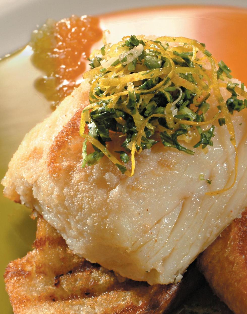 (4 porsjoner)800g utvannet og renset klippfisk4 dl griljérmel10 dl olivenolje16 skiver italiensk brød2 grener frisk basilikum5 dl finhakkede søltørkede tomater• Sett stekeovnen på 200 grader.• Kok klippfisken fem minutter i vann. Tørk fisken og vend den i griljermel.• Hell en desiliter olivenolje i en ildfast form.• Legg klippfisken i formen med skinnsiden ned. Dryss over litt pepper, dekk formen med aluminiumsfolie og bak den i stekeovn i 20 minutter ved 200 grader.• Bland hvitløken med en desiliter olivenolje og fordel oljen over brødskivene.• Stek skivene til de er pent brune.• Kjør basilikum og fire desiliter olivenolje til en jevn grønn saus i foodprosessor.• Sett til side.• Kjør soltørka tomater og fire desiliter olivenolje til en jevn saus i foodprosessor. Kok sausen i to minutter, sil den og avkjøl til romtemperatur.• Anrett klippfisken på et stykke brød med grønn og rød saus omkring.
