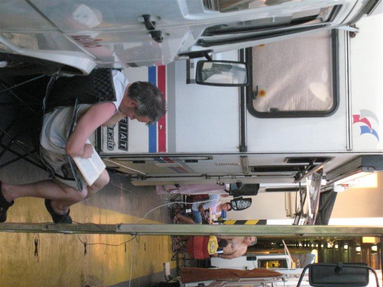 Der blir raskt en god stemning på campingdekket. Folk setter ut et par stoler på den begrensede plassen og man åpner vinduer på vidt gap, med hensyntagen til hverandre. Våre to 16-år gamle jenter sjekker straks ut poolen og vi går på dekk og titter oss litt rundt. Vår gamle bobil ”Berta” står ved siden av ”Dino” med tyske beboere, som skal ta turen helt til Afrika og være borte et år og slik kommer vi i snakk med forskjellige andre campere. Vi er mange som står sammen og ser kveldsolen synke ned i horisonten i et brus av skum fra kjølvannet etter båten.Jentene tar på seg pene klær og går opp for å se litt på kveldslivet, men kommer imidlertid raskt tilbake. Vi nyter alle å sove i den friske havluften, som strømmer inn gjennom vinduene.Allerede kl. 05.30 er det liv på dekket, da vi legger til kai i Igoumenitsa på det greske fastlandet. Lastebiler rygger fra borde og fra campingdekket rygger de bort til en rampe, som lifter dem ned i ”førsteetasje”. Etter et snaut døgn legger vi til i Patras og vi kjører ut i det greske eventyret.