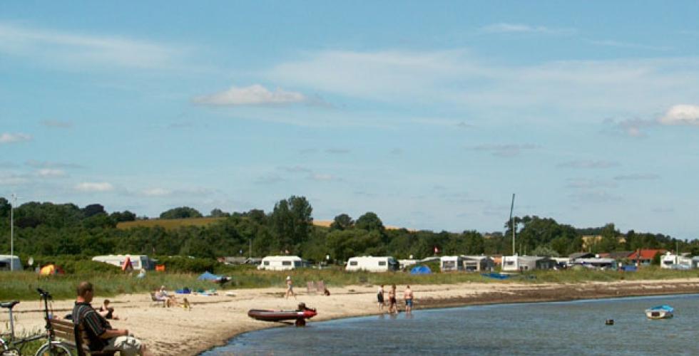 Det er i tillegg 60 båtplasser, så det er mulig å ta med sin egen båt og man kan også kjøpe fiskekort hos campingsjefen og etter sigende fange de flotteste ørreter.Selve stranden er bred og sandet og den ble renset opp på våren, slik at den er innbydende til sommerens vannaktiviteter. Det finnes komfortplasser med vann og avløp og en helt fantastisk utsikt over bukten, men det er også mulig å campe nesten i strandkanten, der du kan sitte med tærne i sanden utenfor din egen vogn.Nærmeste byer er Hoptrup ca. 7 km borte, eller en tur på 14 og 16 km. til henholdsvis Haderslev og Aabenraa.