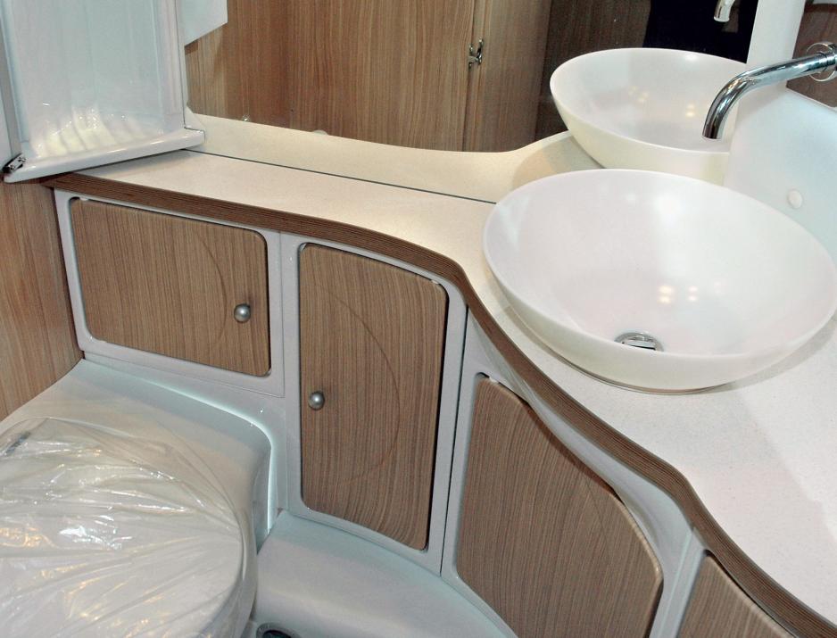 Sanitærrommet er plassert midt i vogna mellom kjøkkenet og sovedelen. Avtredet er et Thetford kassettoalett med elektrisk pumpe og trallefunksjon. Vasken er av plast og plassert i et hjørne med speil på begge sider. Til oppbevaring er det fire underskap.Skapdørene er av tynn plast og virker billige og slarkete. Personlig ville jeg kommet til å irritere med over disse hver gang jeg satt på potta.