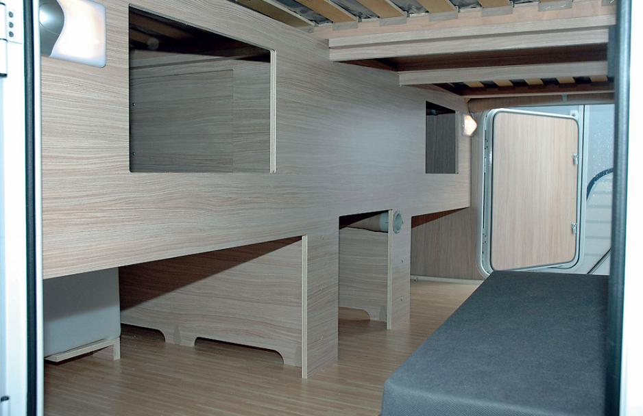 Sovedelen er plassert helt bakerst i vogna og legger beslag på om lag en tredjedel av grunnflaten. Da er det plass til to enkeltsenger med som er 85 centimeter brede og 200 centimeter lange. Soveplassene er delt av en midtgang. Mellom sengene er det en midtgang. En uttrekkbar lem kan legges over midtgangen og soveplassen gjøres enkelt om til ei brei dobbeltseng. Ypperlig for to besteforeldre som har med seg barnebarnet på tur. På grunn av lagerplassen under soverommet er sengene hevet. Kanskje litt for høyt, vil nok noen mene.