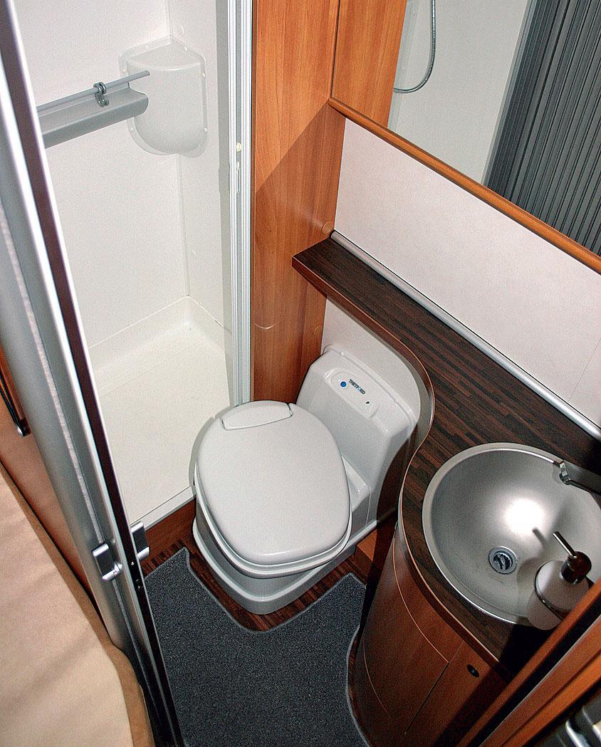 Toalettrommet måler 90 x 82 x h 198 cm og den separate dusjen 80 x 52 x h 189 cm. Med denne løsningen med toalettrommet ved siden av dobbeltsengen, blir det alltid trangt. Imidlertid har vi opplevd bedre løsninger enn den Hymer har valgt, her var det trangt. Som vanlig anbefaler vi potensielle kjøpere og gå inn, lukk døren og foreta alle naturlige manøvre i rommet. Å bøye seg ned mot vasken krever omhyggelig plassering av føttene.Et lite veggskap med en hylle og et lite benkeskap under vasken kunne vært bedre utnyttet med hylle til hvert sted. Men dette lar seg lett ordne i ettertid. I dusjen er det ikke spor av fuging, men kunststoffbekledningen overlapper slik at vannet ikke skal komme på avveie.En takluke i dusjen får dampen ut etter en dusj, tre spotter gir godt lys og doen er gode gamle Thetford C200. Dårlig bevegelsesfrihet på badet er en ulempe.