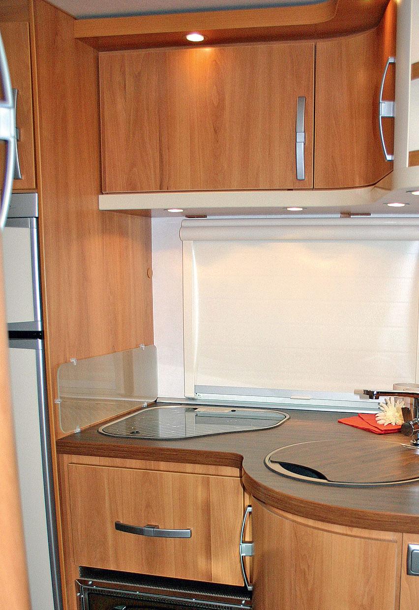 Kjøkkenbenken i vinkel måler 98 x 58/93 x h 92 cm. Tre bluss, oppvaskkum og stekeovn hører til utstyret på kjøkkenet. Til venstre over hjulkassen står stekeovnen med bestikkskuffen over. Til høyre har vi den dype delen av benken, men her er plassen dårlig utnyttet. Det er 90 cm fra veggen og ut, mens det er montert to uttrekkbare trådhyller på 40 cm dybde. Her er det plass til mye mer. Over-skapene derimot er godt utnyttet med høye dører som gir god adgang. Det er ikke avtrekksvifte, men som kompensasjon er det luftevindu og takluke rett over benken. Som tidligere nevnt er det rikelig med lys, fire spotter under overskapet og seks i taket over. Kjøleskapet er plassert i seksjonen ved siden av kjøkkenbenken, og er et skap fra Dometic av typen RM7655L med automatisk energivalg og med separat frys (totalt 143 liter med 26 liter frys). Bra kjøkken, men plassen er dårlig utnyttet i benken.