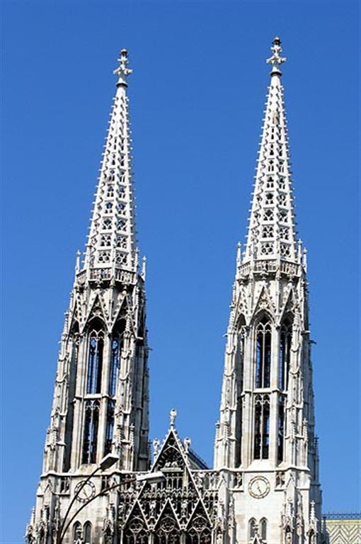 Den er ikke særlig gammel, bare 125 år. Den ble innviet i 1879 etter en folkeinnsamling av penger. Den er bygget i nygotisk stil og stor som en domkirke, noe som den imidlertid aldri er blitt opphøyet til. Det var den daværende keiserens bror, som tok initiativ til innsamlingen, i takknemlighet for at keiseren hadde overlevd et attentat. Kirken ligger for øvrig rett ved siden av universitetets hovedinngang og det er en liten vakker park ved kirken, der vi satt og nøt folkelivet på boulevarden foran oss, samtidig som vi kan beundre de vakre tvillingtårnene, som står helt hvitt mot en dypblå himmel.