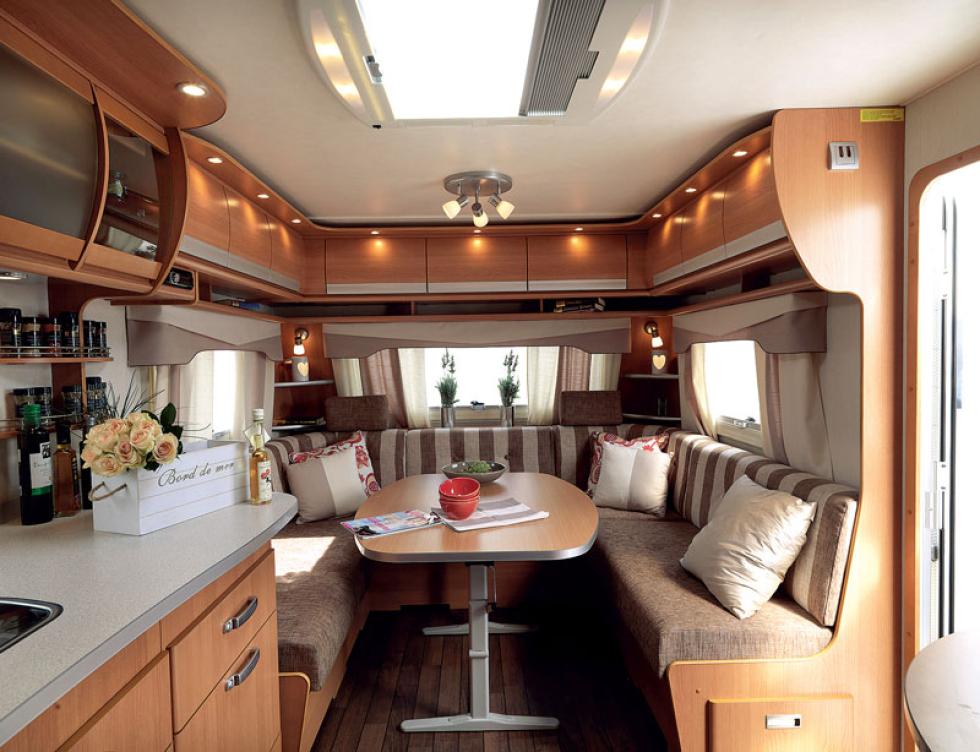 Kjøkkenet befinner seg på motsatt side av inngangsdøra. Der befinner det seg nedfelt gassbluss og oppvaskkum. De tre gassblussene lengst til venstre og oppvaskkummen i midten av kjøkkenbenken. Til høyre er det satt av god plass til arbeidsplass. Benken er 160 centimeter bred og 65 centimeter dyp. Arbeidshøyden er på greie 91 centimeter. I vognen vi testet var det stekeovn. Dette er ikke en del av standardutrustingen. Standard er derimot det 190 liters kjøleskapet med avtakbar frysedel. Kjøleskapet er plassert til venstre for kjøkkenbenken. Mellom gassblussene og stekeovnen er det en skjærefjøl og under ovnen er det blitt plass til en liten skuff. Under vasken er det en stor skuffeseksjon. Helt øverst en bestikkskuff. I midten en stor skuff, der bredden er 48 centimeter, høyden 32 og dybde på 47 centimeter. Her er søppelbøtta plassert. Nederst er det en mindre skuff. Dybde og bredde er den samme, men høyden er 20 centimeter. Helt til høyre er det nok en skuffeseksjon. Målene er de sammen som seksjonen under vasken. Mellom overskap og kjøkkenbenk er det to krydderhyller. I overskapsrekka har det blitt tre skap, som er det i to med ei hylle. Høyden er 40 centimeter, bredden 51 og dybden er 31 centimeter. Helt til venstre sitter kontrollpanelet. Samtlige skap har innvendig lys. Under overskapet er det montert avtrekksvifte. Lyssettingen er god. Tre spotter under overskapet og tre i taket gir godt lys. Konklusjonen er et svært godt kjøkken, der det er plass til to kokker samtidig.