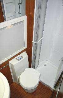 Toalettrommet er plassert på siden av sengen bak. Denne velkjente løsningen har den ulempen at både sengen og badet bliver smalt. Laika har laget toalettrommet ekstra bredt rundt toalettet, noe som gjør sengen smal i hoftehøyde. Uansett, med denne løsningen har fabrikken prioritert badet og det er lett å bevege seg å utføre de forskjellige gjøremålene rommet er beregnet på. Selve rommet måler 109 x 81/93 x h 193cm, den separate dusjen 60 x 70 x h 193cm. Rommet er fint utført med møbler i tredekor. Fin vask og toalett fra Thetford av typen C250 fungerer bra. Vi likte også veggskapet med hyller og speil, videre var det et greit skap i benken under vasken. God lufting i og med et stort luftevindu og takluke. Og fin LED-belysning. Tatt i betraktning denne planløsningen, lyst og luftig og bra bevegelsesfrihet.