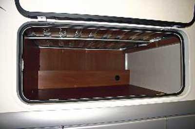 Klarer du deg uten en garasje for sykler, rommer det utvendige bagasjerommet alt det nødvendige, målene er 123 x 115/134 x h 50cm. Klesskapet måler 57 x 54 x h 125cm og det er i tillegg to store skuffer. Klesskapet har innredningens eneste lampe med glødepære. Det er tilstrekkelig med overskap mens oppbevaringsplassen på kjøkkenet er noe begrenset.