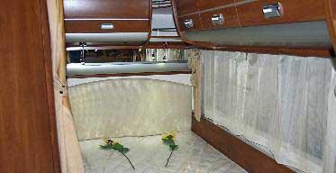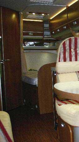 Sengen måler 196 x 132/118/105cm der 118 er i hoftehøyde og 105 ved fotenden. Ved valg av denne bilen bør nok dette studeres nærmere, som er det eneste ankepunktet vi har. Det er 12cm madrass på fjærende treribber og liggekomforten er det ikke noe å si på. Soveværelse har et gedigent luftevindu, 140cm langt, dessuten takluke. Ovnen er plassert under sengen, det er ingen grunn til å fryse her. Bra seng men noe smal.