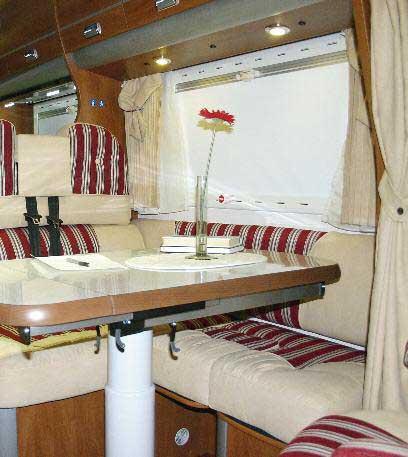 L-sofa for to, sidesitter for to og vendbare forstoler gir en fin sittegruppe for seks personer. Bordet står på søyle og kan skyves i to retninger. Det måler 61 x 80cm og kan forlenges med klaff til 105cm. Et lite problem, bordet er for høyt. Det er 83cm fra gulvet og opp, det skulle vært ca. 10cm lavere. Også sittehøyden er litt høy, noe som utjevner det høye bordet. L-sofaen kan selvfølgelig åpnes slik at to personer kan sitte i fartsretningen med belter. I denne benken ligger vanntanken, i den fremste delen av sofaen er batteriet oppbevart. I sidesitteren er det mest bagasjeplass, men også noen komponenter til elanlegget. Omgjort til seng måler denne 215 x 105/135cm, altså god plass til en person. Bortsett fra bordhøyden var vi godt fornøyd med sittegruppen.