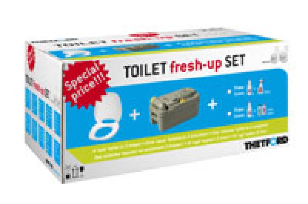 Det nye Fresh-up settet gjør det brukte toalettet så rent og fint som om det var nytt. Settet inneholder et sete med lokk og en avfallstank i tillegg til de tre gratis og miljøvennlige rengjøringsmidlene.Aqua Kem Green er en væske beregnet til daglig rengjøring og vedlikehold og den er trygg å bruke i septiske tanker og forenkler dessuten biologisk nedbryting av avfall. Aqua Rinse har lavendelduft og forenkler jevn spyling. En tredje væske er Cassette Tanl Cleaner og brukes nå og da for å få bort vanskeligere kalkbelegg som kan oppstå.Fresh-up Set 1: passer alle Thetfords kasettoaletter (C2, C3, C4), både høyre- og venstreversjoner dersom disse er laget etter den 1. januar 1994. Instruksjonsbok medfølger, men utskifting av toalettsetet og lokket er veldig enkelt å utføre.Fresh-up Set 2: passer Thetford kassett C-200.