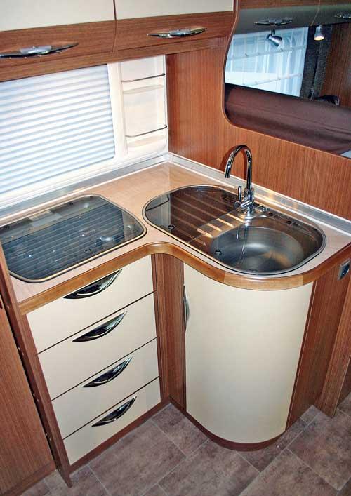 Kjøkkenbenken i vinkel måler 100 x 53/100 x h 93cm. Dette har nærmest blitt et standardmål for slike benker. Med tre bluss og oppvaskkum med dryppebrett, blir det ikke så mye plass igjen som arbeidsflate. Da gasskassen er plassert i benken er det begrenset med plass til oppbevaring. Tre skuffer og et smalt skap med en liten hylle og dobbel søppelbeholder er det man har til rådighet. Overskapet har avtrekksvifte og to spotter. Vi kunne tenke oss litt høyere dører, over hylla er det en åpning på 13 cm i høyden, litt tuklete når du leter etter noe i et fullt skap. På den annen side, alt er smakfullt utført. På motsatt side står kjøleskapet, eller Tectower. Det er altså et skap fra Dometic av typen RMT 7655 på 143 ltr. netto med 26 ltr. separat frys og stekeovn på toppen. Ved siden av er det en hylleseksjon som går fra gulv til tak, denne kan gjøre susen ved mangel på oppbevaringsplass på kjøkkenet. Pent men ellers gjennomsnittlig.