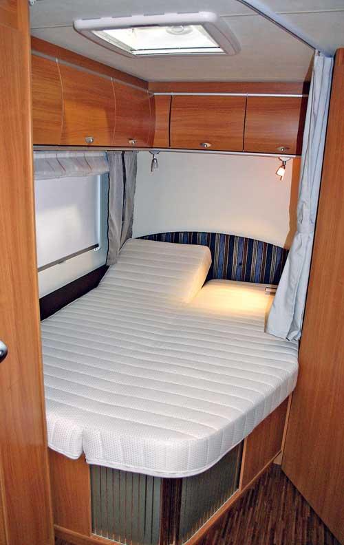 Sengen har de Vanlige målene for denne løsningen, 196 x 131/100cm. Madrassen er 14cm tykk og ligger på fjærende treribber. Sengens bredde er akseptabel, men noen synes det er en ulempe at den smalner av til en meters bredde ved fotenden. Bortsett fra det kjennes sengen behagelig ut med komfortabel madrass. Lufting besørges av luftevinduer, ett på siden av sengen og ett ved hodeenden. Supplert med takluke skulle det gi god lufting under varme netter. To spotter for leselys dekker behovet for belysning, så langt alt på det jevne. Nytt er det at sengebunnen kan heves i den øverste delen for behageligere lesestilling. Det er et pluss, men litt slitsomt å få den ned igjen når du er i ferd med å sovne.