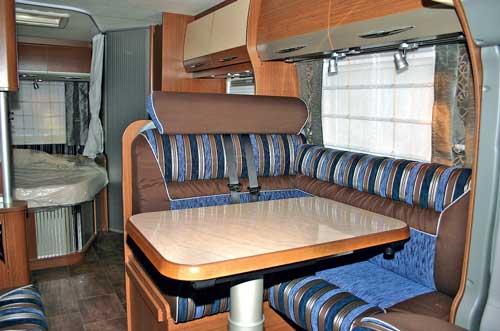 Ikke overraskende består denne av en L-sofa, to vendbare forstoler og en sidesitter. Selv om sidesitteren er nesten 80cm bred anser vi sittegruppen for fem personer. Men da sitter man komfortabelt. Og putene i L-sofaen gir korsryggstøtte, ofte er de nesten rette. Er det noe Bürstner kan så er det å velge stoffer. Putene er sydd av tre forskjellige stoff og tar seg godt ut. «Gardinene» på hver side av vinduene derimot består av to stoffer, men er bare til pynt. Uansett, tekstilene sammen med møblene i såkalt nøttetre Merano med hvite felt, tar seg godt ut. L-sofaen kan omgjøres til toseter i kjøreretningen, i denne er vanntanken plassert. I sidesitteren er batteriet og elblokka plassert. Det er fortsatt plass til bagasje, men vær forsiktig, det ligger myke varmluftslanger i bunnen. Noe litt tung vil kunne klemme disse flate. Batteriet er på 90Ah og det er plass til ett til. Bordet måler 90 x 57cm og kan skyves både på langs og på tvers. Og trykkes ned til sengehøyde der sengen, med diverse tilleggsbiter, måler 200 x 122cm. En tiltalende sittegruppe.