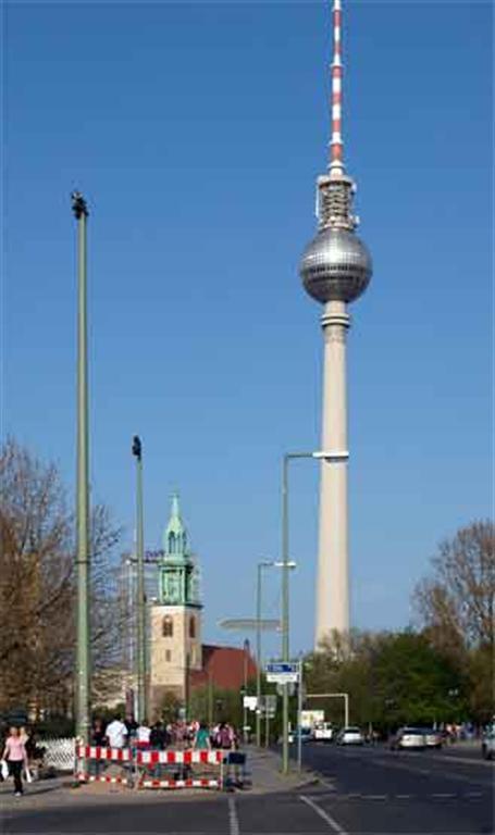 Alexanderplatz rommer i tillegg til det markante antennetårnet også Mariekirken, samt et uttall av kafeer. ”Alex” er Berlins geografiske sentrum.Karl-Marx-Allé er den siste del av aksen gjennom Berlin. Her finnes mange pompøse bygninger fra 1950 tallet, oppført av Sovjet som gjenoppbyggingshjelp. Gaten er en 3 km lang og veldig bred bulevard. Den er hjemsted for mange mindre forretninger, hvorav en del bokhandlere.
