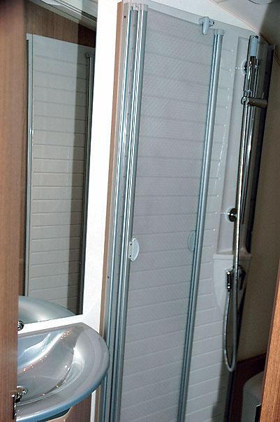 Badet er plassert på langveggen ved side av kjøkkenet. Med det samme du kommer inn i rommet finner du håndvasken i hjørnet. Over vasken og op til taket er det plassert et stort hjørnespeil. I taket over er det to spotter og under vasken et hjørneskap. Dette er delt i to med ei hylle. På motsatt kortvegg er det plassert et Thetford kasettoalett. Når en sitter på denne «potta» er det til venstre laget til noe oppbevaringsplass. Et lite skap, to små hyller og en dorullholder. En fiffig løsning med to solide, leddede dører av plast gjør dusjing til en fornøyelse. Med disse to dørene blir både toalettdelen og håndvaskdelen isolert fullstendig og en får et lukket dusjkabinett med god plass og fast dusjarmatur. Med tanke på en aktiv jakttur eller fisketur utenfor allfarvei er dette badet ypperlig. Sanitærrommet har egen takluke. I døra er det monter fire knagger til håndklær.