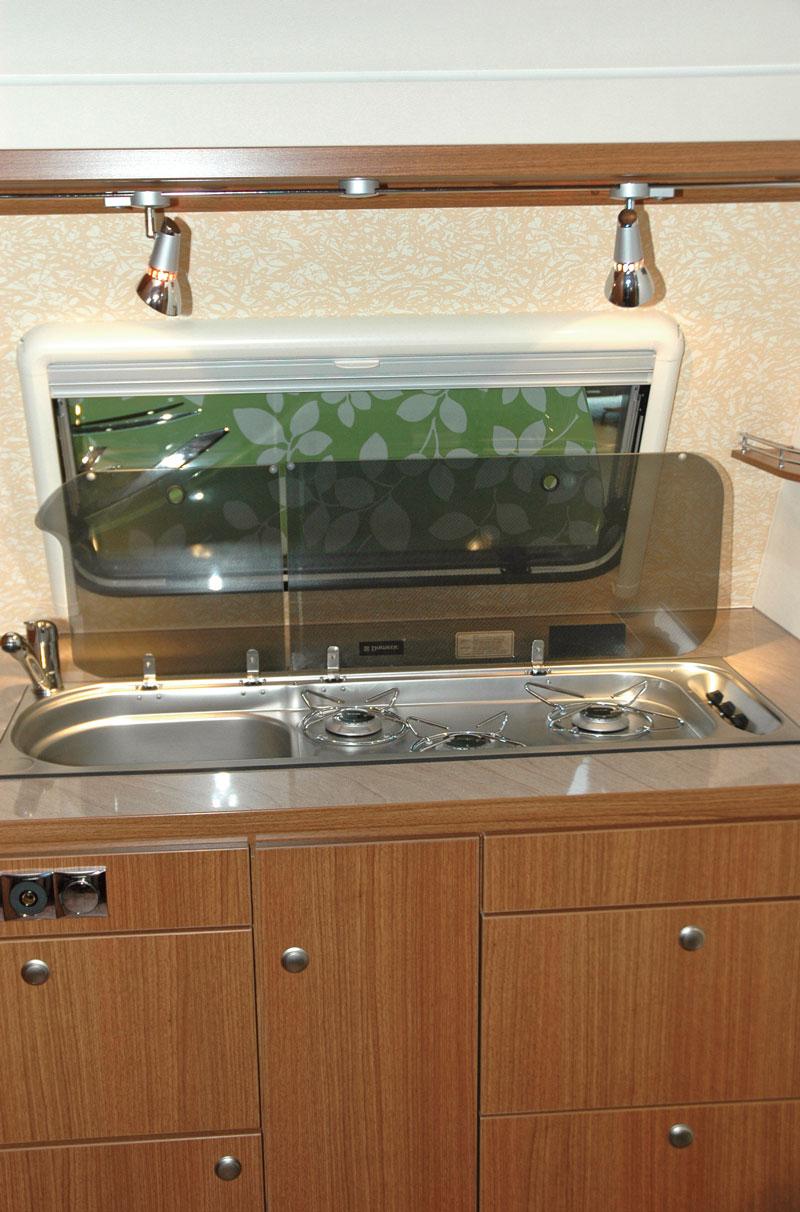 Plasseringen av kjøkkenet er helt fremst i vogna. Kjøkkenbenken måler 138 gange 76 centimeter. Arbeidshøyden er på passelige 94 centimeter. Det meste av benkeplassen opptas av et nedfelt Dometic gassbluss og oppvaskkum. De tre gassblussene er slik plassert i forhold til kummen at renhold av gassblussene blir enkelt. Alt er støpt i den samme formen. Kjøkkenet har ingen overskap og dermed heller ikke avtrekksvifte. Under kjøkkenbenken er det bra med lagerplass for det man trenger på et kjøkken. Til høyre finner vi en stor skuff. Denne er 24 centimeter høy, 45 bred og 47 centimeter dyp. På ei skinne inne i denne skuffen er bestikkskuffen. En fin løsning. Spisebestikket er øverst og sleiver, stekespader og den slags nederst. Skuffen under denne har samme bredde og dybde. Denne er hele 37 centimeter dyp og rommer greit nok det to personer trenger stekepanner og kasseroller. Helt til venstre er det to tilsvarende skuffer. Den øverste her er ikke delt. Mellom de to skufferekkene er et lite skap med plass til ei medfølgende søppelbøtte. Over benkeplata er det satt inn ei åpen hylle som er 137 centimeter bred og 20 dyp. I hjørnene under denne er det plassert to små krydderhyller. To spotter, takluke og vindu over kjøkkenbenken gir et greit lys. Et Dometic kjøleskap med fast frysedel er plassert til venstre for inngangsdøra. Helt grei plassering i forhold til kjøkkenet.