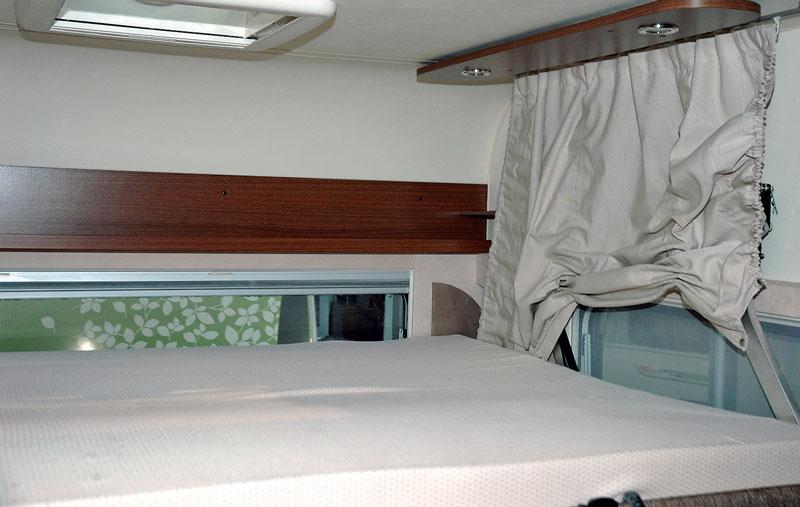 I denne vogna er det to soveplasser. Disse er i senkesenga over sittegruppen. Liggeflaten er på 145 gange 197 centimeter. Helt nedsenket er madrassen 143 centimeter over gulvnivå. For å komme opp i senga er det derfor plassert en løs stige under madrassen. Denne hektes på når senga er senket og gjør det greit å komme opp og ned. Fra madrassen og opp til taket er det 73 centimeter. Det er nok, selv for sånne som meg, som har noen småtendenser til klaustrofobi. Madrassen er prøveligget og funnet godkjent. I hodeenden er det to lesespotter og på bakveggen over senga er det ei åpen hylle i hele vognas bredde. I tillegg er det ei lita takluke over senga. Heve og senkemekanismen er elektrisk drevet, men kan også betjenes manuelt ved å fjerne en splint og en bolt. Sengetøyet må ikke fjernes ved heving, men det fører til senga ikke går helt opp i taket. For meg, som er 173 centimeter høy, ga det ikke noe ubehag ved å ikke kjøre senga helt opp. Takhøyden i sittegruppa var likevel god nok. Løsningen gir vognas beboere ei fullgod dobbeltseng, selv om det ikke er satt av plass til et eget soverom. Karaktersettingen av soverommet valgte meg store kvaler. Det blir liksom litt sovesofafølelse, selv om det er bra sengebunn og god madrass. En sekser ble komplett umulig.