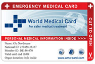 Hvis man får bruk for en lege, når man er på utenlandsreise, kan det fort oppstå kommunikasjonsproblemer eller misforståelser. Hvis du har et World Medical Card er du bedre rustet, hvis du skulle få bruk for legehjelp i utlandet.Kortet er enkelt å åpne ved sykdom, ulykke eller annen nødsituasjon og kan inneholde- Kontaktinformasjon på pårørende- Diagnoser- Medisin- Allergier- Medisinsk historikk- Blodtype- Stillingtagen til organdonasjon- Valgfri informasjon