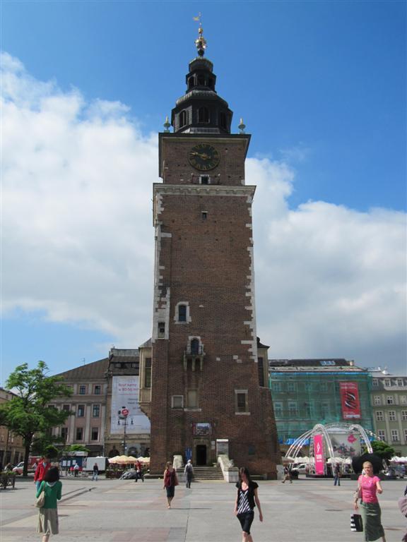 Det flotte rådhuset (mot vest) troner flott over markedsplassen. Det er bare selve tårnene som er igjen av det opprinnelige rådhuset fra 1383. Krakow unngikk de store ødeleggelsene under 2. verdenskrig og det for markedsplassen også utrolig flott med mange gamle bygninger. Rett ved siden av rådhuset står den lille sjarmerende St. Aldaberts Kirke, som daterer seg helt tilbake til år 1.000.